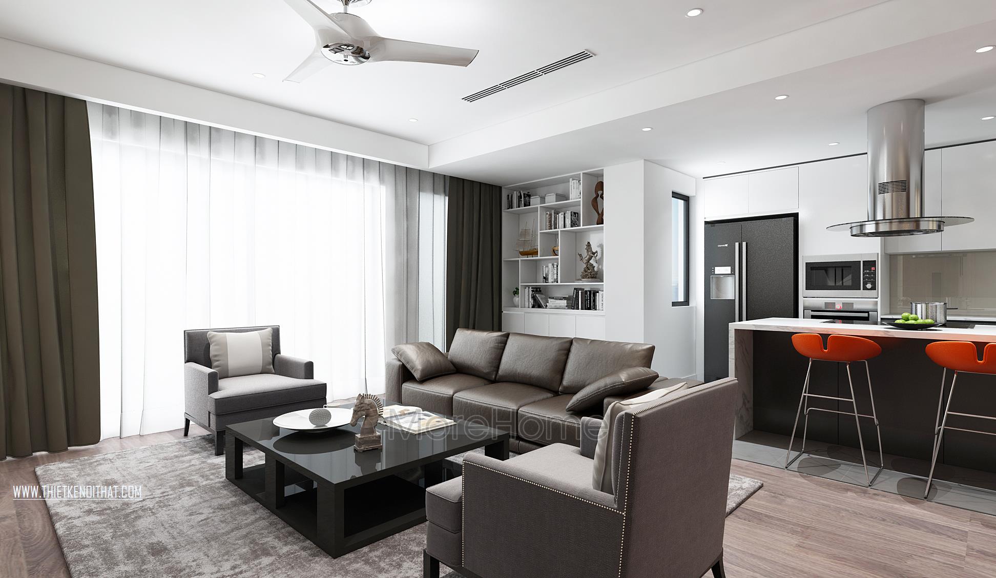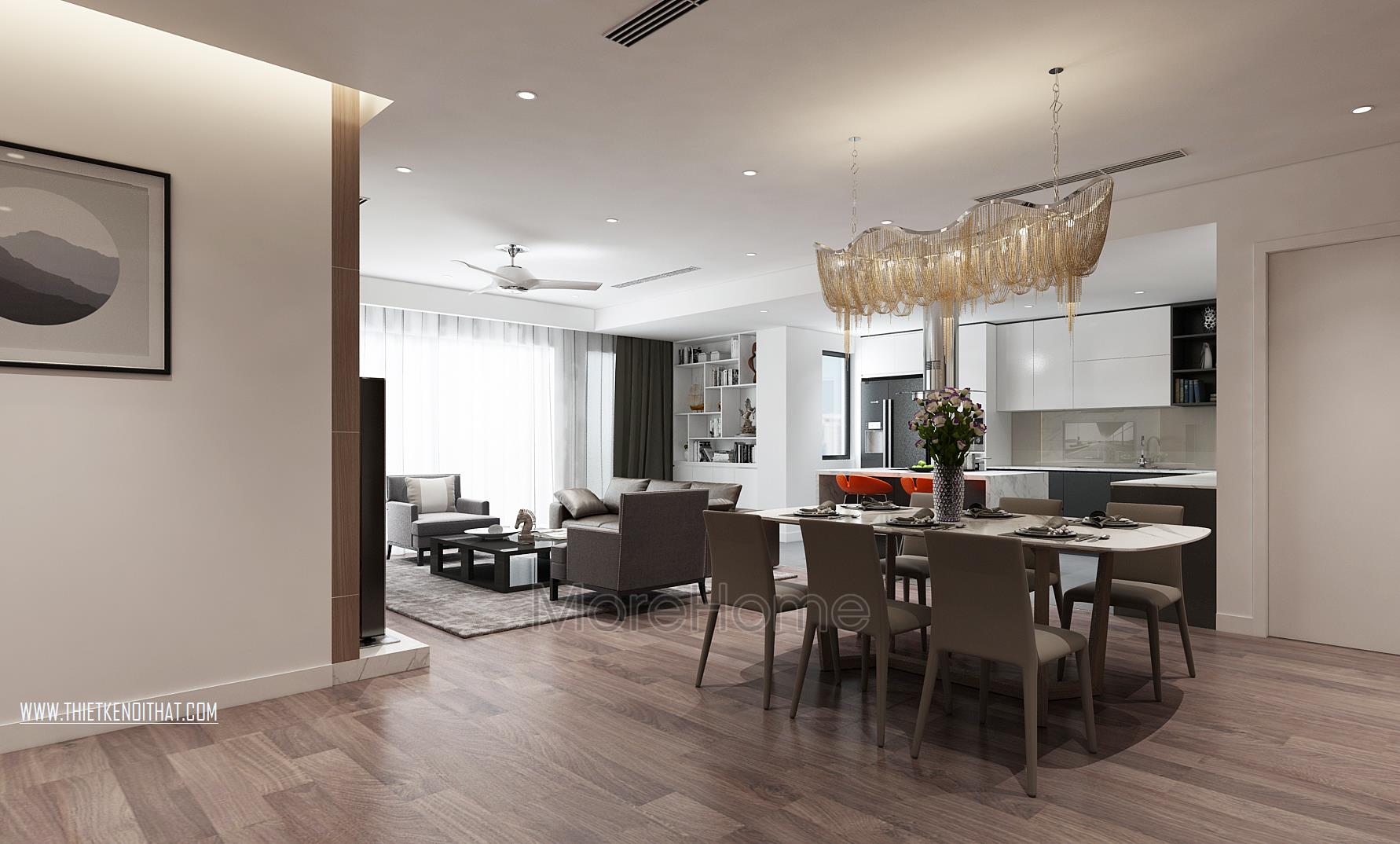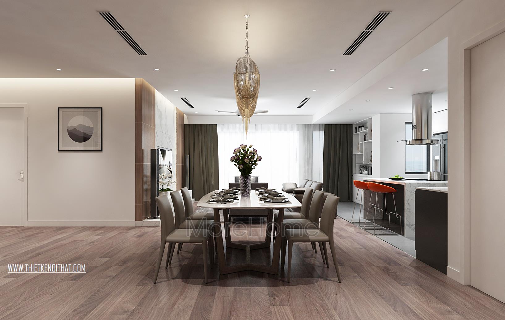 Thiết kế bếp và bàn ăn liền kề không tạo vách ngăn chặn đứng vì vậy tạo cảm giác thoải mái và dễ chịu cho không gian sinh hoạt chung. Thiết kế vẫn trung thành sử dụng các đường nét đơn giản, không đi sâu vào chi tiết. Tone màu sử dụng trung tính giúp giữ được vẻ sạch sẽ, tươi mới cho không gian, đồng thời các chất liệu sử dụng trong bếp là các chất liệu nhẹ, bền, có độ bóng cao như đá tự nhiên, gỗ veneer,… giúp linh hoạt và dễ dàng trong việc dọn dẹp, lau chùi.