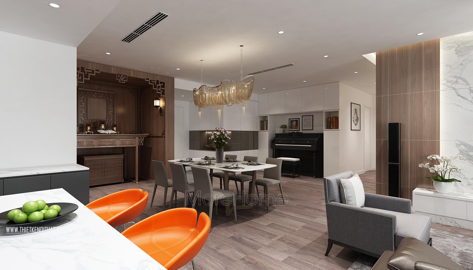 Thiết kế nội thất không gian thờ cúng được gia chủ vô cùng chú trọng. Không gian bàn thờ linh thiêng được sắp đặt tại vị trí trung tâm của căn nhà. Đây là một trong những thiết kế vô cùng quan trọng trong thiết kế nội thất, không gian thờ cúng không chỉ là nơi linh thiêng mà theo tục lệ dân gian, đây còn là nơi mang lại sinh khí cho căn nhà, mang điều tốt lành và sự bình yên đến với gia chủ. Chính vì ý nghĩa sâu xa này, chúng ta có thể dễ dàng thấy được đây là sự kết hợp không chỉ là vẻ đẹp thẩm mỹ mà đó còn là vẻ đẹp phong thủy và tâm linh khi thiết kế.