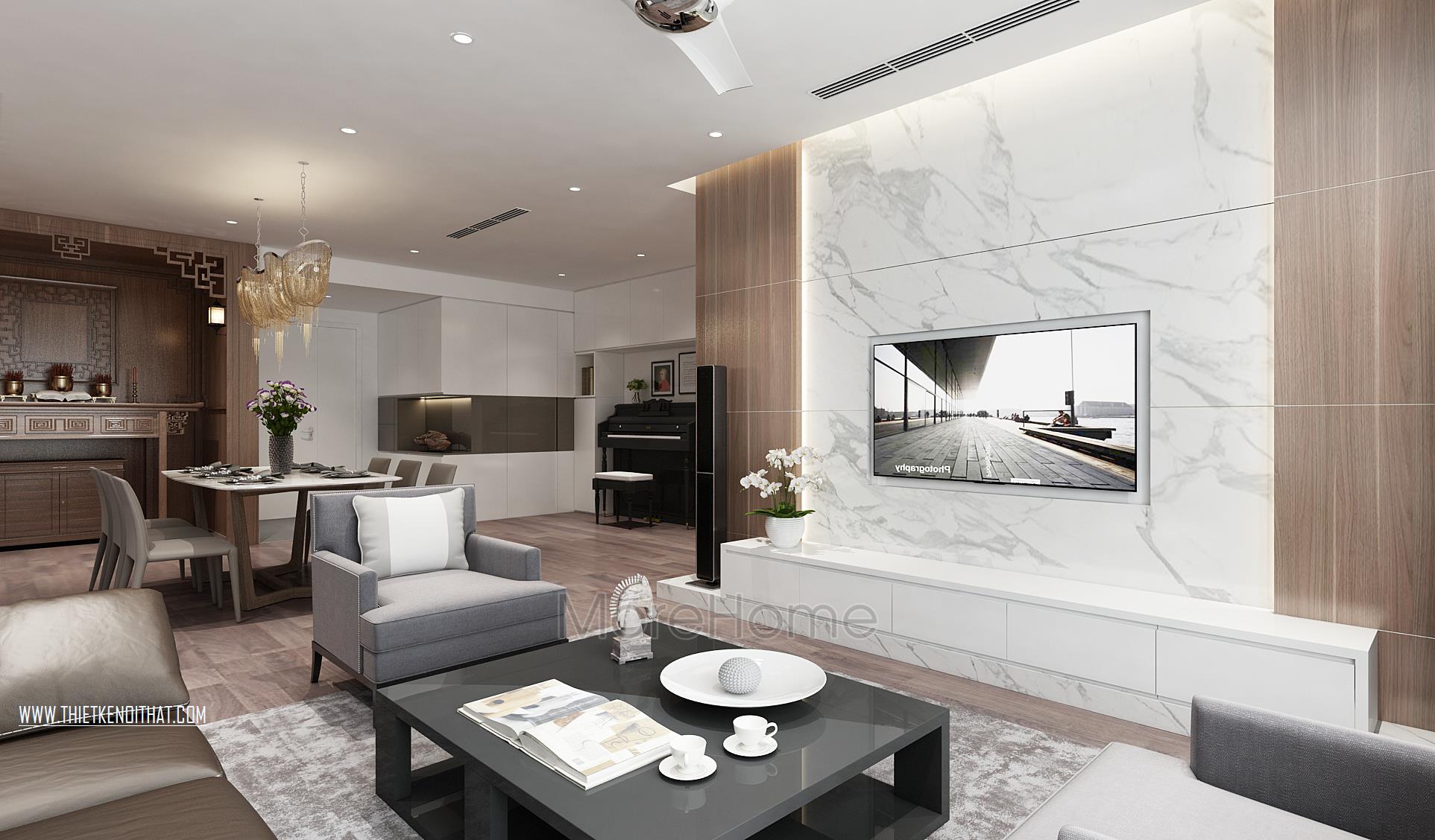 Thiết kế nội thất biệt thự Penthouse không quá cầu kỳ vào từng chi tiết trang trí, hầu hết các hình khối và đường nét sử dụng là các chi tiết đơn giản, không cầu kỳ. Đặc điểm của thiết kế nội thất phong cách hiện đại căn hộ Penthouse Imperia Garden lấy điểm nhấn từ màu sắc và ánh sáng. Thiết kế chú trọng đến sự thoải mái và giản đơn, sự cân bằng giữa ánh sáng nhân tạo và ánh sáng tự nhiên cũng là điểm lưu ý đặc biệt trong thiết kế giúp mang lại cảm giác hài hòa cho không gian sống. Với những diện tích hạn chế, thiết kế nội thất chung cư thường ưu tiên sử dụng các tone màu sáng, trắng từ đó giúp không gian trở nên mở và thoáng hơn.