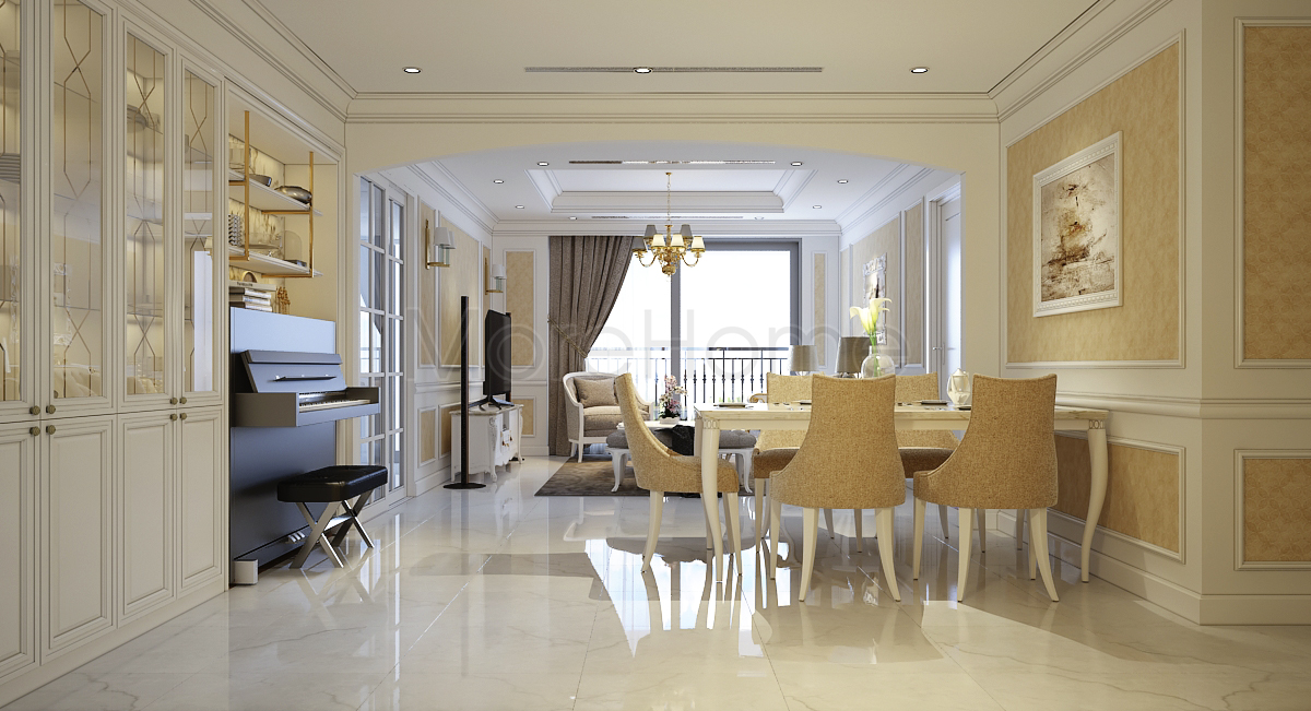 Thiết kế bàn ăn quây gọn, thiết kế cong nhẹ nhàng, đơn giản nhưng vẫn tạo được điểm nhấn. Thiết kế sử dụng hai tone màu cơ bản là vàng kim nhẹ nhàng và trắng, đây là hai màu sắc đặc trưng của tân cổ điển thể hiện sự sang trọng của thiết kế. Tranh treo tường là một vật trang trí không thể thiếu giúp không gian trở nên sống động và có hồn hơn.