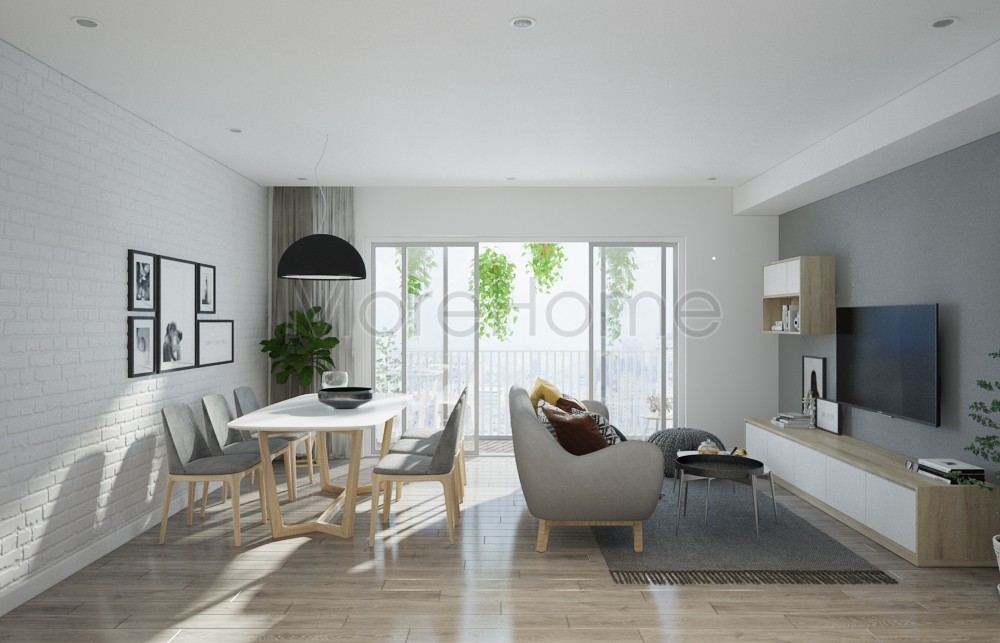 Thiết kế sử dụng vật liệu gỗ là đặc điểm nổi bật của phong cách thiết kế này. Các đồ đạo phòng khách ưu ái sử dụng gỗ làm vật liệu chủ yếu của thiết kế này. Tủ gỗ và sofa được thiết kế với phong cách đơn giản, không cầu kỳ hay chi tiết vì vậy khắc họa được rõ nét đẹp hiện đại mà không làm ảnh hưởng đến diện tích sử dụng. Bên cạnh đó, thay vì thiết kế tường thô vây kín tạo cảm giác tối tăm, gò bó, thiết kế căn hộ Masteri lại khéo léo thay thế tường thô bằng kính cường lực trong suốt, giúp không gian mở trở nên vô cùng sáng, rực rỡ và tràn đầy sức sống, góp phần lớn mang đến sự thoải mái và hứng khởi cho căn nhà.
