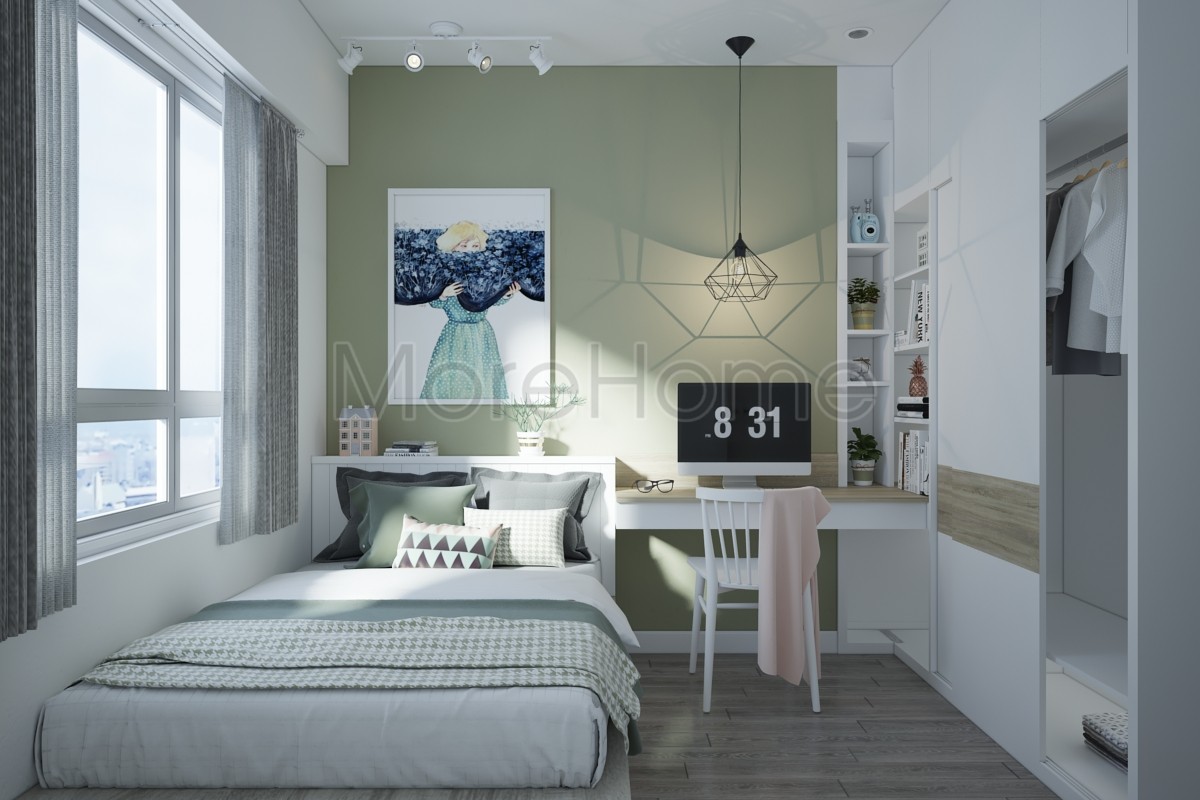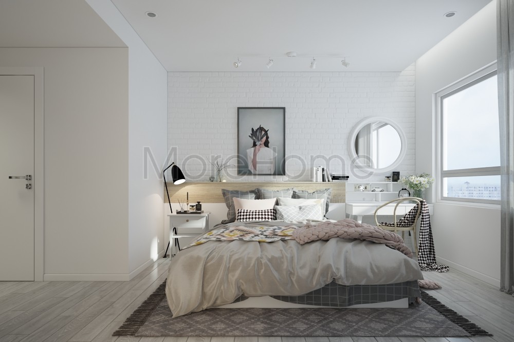 Thiết kế nội thất phòng ngủ phong cách Scandinavian ưu chuộng sử dụng các gam màu lạnh, gợi cảm giác tinh tế, trang nhã. Các sắc nâu nhẹ, đơn giản, họa tiết ô vuông trang trí được kiến trúc sư kết hợp một cách khéo léo tạo một không gian mang đậm phong cách Bắc Âu. Tone màu trắng vẫn là màu sắc được kiến trúc sư ưu ái sử dụng ở không gian này.