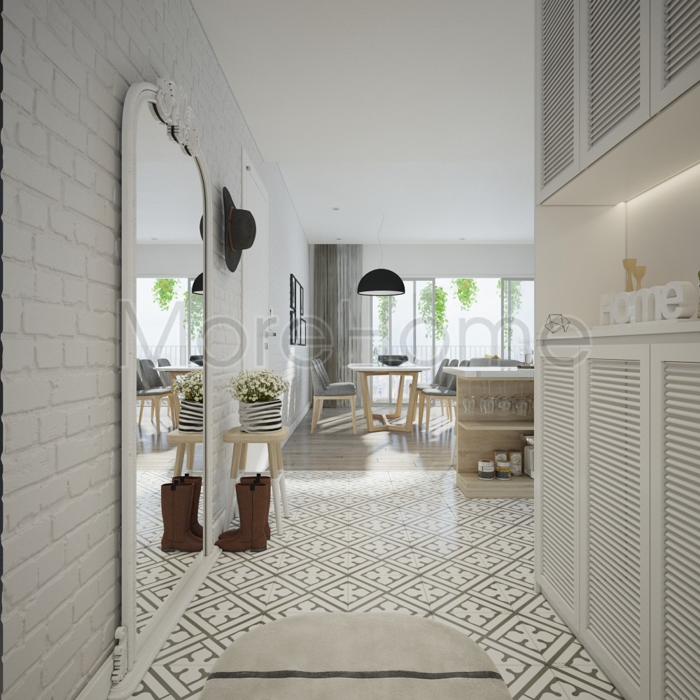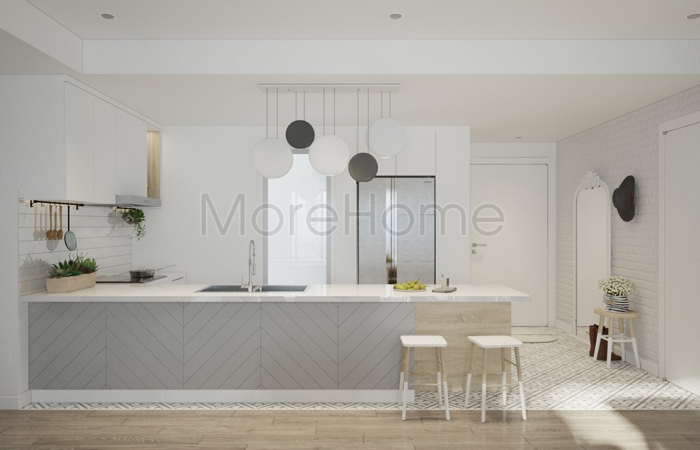 Tiếp theo là thiết kế nội thất bếp và khu lối dẫn vào căn nhà. Một điểm nổi bật của thiết kế này chính là đường nét và hoa văn. Những màu xám, trắng và những tone màu đất tinh tế là những màu sơn phổ biến nhất trong những ngôi nhà mang phong cách Scandinavian. Những màu này được pha trộn với những màu đậm của những mẫu hoa văn tinh tế. Chúng không chỉ làm nổi bật các tone màu của hoa văn, mà còn làm cho ngôi nhà của bạn trở nên vô cùng sang trọng. Căn bếp không có thiết kế tủ cao cầu kỳ mà thay vào đó là tủ nhỏ tạo không gian thoáng và mở ở trên, gợi một không gian liền mạch, tạo cảm giác cơi nới cho không gian.