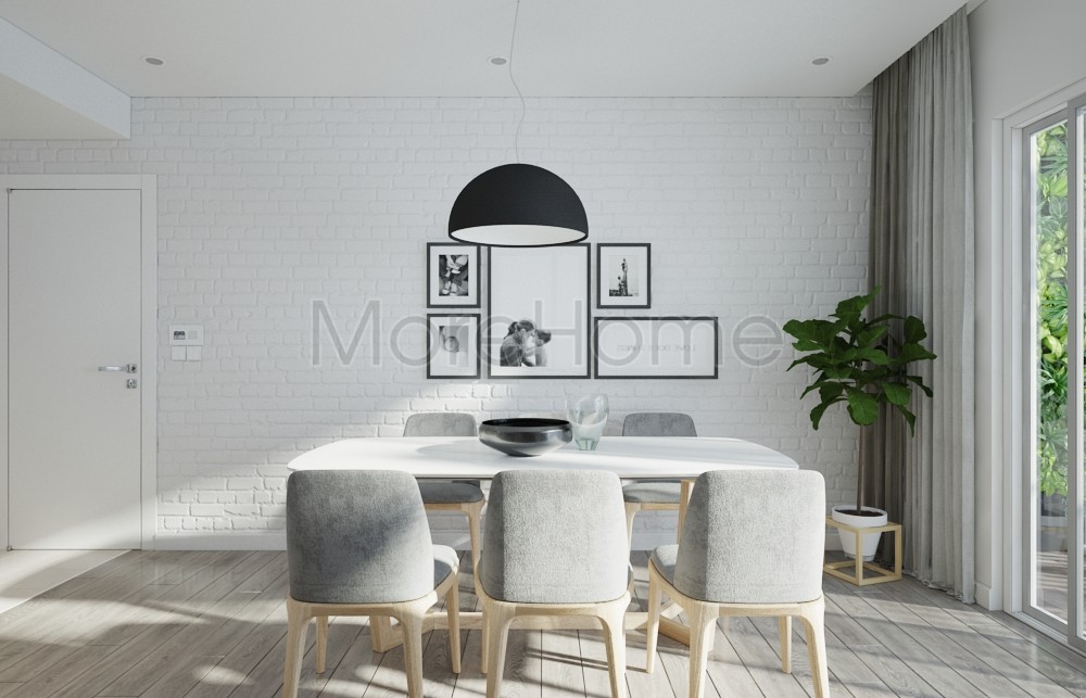 Thiết kế nội thất bàn ăn liền kề với phòng khách tạo không gian liền mạch, vừa tiết kiệm diện tích lại mang lại sự tiện nghi cho gia chủ. Bàn ăn không có thiết kế trạm khắc quá nổi bật, chỉ đơn giản là không gian quây quần nhỏ, gọn và giản đơn. Thiết kế tường thô đơn sắc được thay thế bằng tường gạch nổi thô, ráp, ấn tượng. Khái niệm đơn giản về thiết kế tường thô đơn sắc đã được thay thế bằng các thiết kế đa dạng và ấn tượn hơn rất nhiều. Ngoài ra, các bức tranh nhỏ, đen trang trí hay cây xanh cũng chính là điểm nhấn thẩm mỹ giúp hoàn thiện vẻ đẹp cho căn nhà.